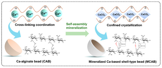 A total of 2 g of sodium alginate (Aladdin Ltd., AR, Shanghai, China) powder was dissolved in 100 mL of deionized water followed by being stirred for 40 min at 85 °C. After that, the sodium alginate sol was dropped into 2% wt. CaCl2 (Aladdin Ltd.) solution by a syringe pump to form a kind of spherical Ca-based polymer, Ca-alginate beads (raw sample, named as CABs). These hydrogel beads were then impregnated and mineralized by 100 mL NH4HCO3 solutions (Aladdin Ltd.) with certain concentrations (0.5%, 1%, and 1.5% wt., which were named as MCAB-0.5, MCAB-1, and MCAB-1.5, respectively) in a stable-temperature oscillation shaker at 150 rpm for a number of hours. After that, these samples were washed until Ca2+ and Cl− ions were undetected in the leachates, followed by drying in a freezer dryer for testing (80 Pa, −50 °C).