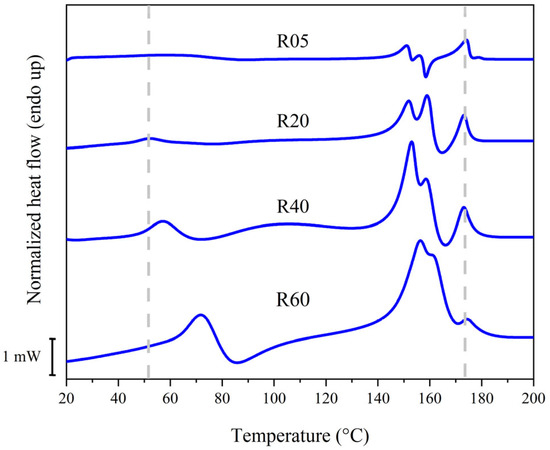 A DSC6 (PerkinElmer, Waltham, MA, USA) was utilized for the purpose of conducting Differential Scanning Calorimetry (DSC). The procedure involved the measurement of approximately 5 mg of the sample, which was then placed in an aluminum pan. Subsequently, the pan was sealed with a lid and inserted into the calorimeter. The sample was then subjected to a heating or cooling scan under nitrogen flow of 20 mL/min. The heating rate was set at 20 °C/min, unless otherwise specified. The glass transition temperature (Tg) was determined by determining the midpoint of the change in baseline of the calorimetric curve, and its specific heat increment (Δcp) was calculated based on the difference between the first and second baseline. Furthermore, the melting temperature (Tm) was identified by locating the maximum of the endothermic peaks, and the melting enthalpy (ΔHm) was determined by calculating the area between the peak and the baseline.