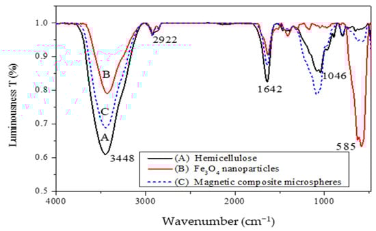 Figure 3 shows the infrared spectrograms of hemicellulose (A), Fe3O4 nanoparticles (B), and magnetic hemicellulosic microspheres (C, sample 4). The spectral peak positions for A and C are nearly identical, indicating that the primary functional groups of hemicellulose remained intact during the creation of the magnetic composite microspheres. This suggested that hemicellulose was dissolved in the ionic liquid without undergoing any derivatization reactions. The peaks at 3448 cm−1 and 2922 cm−1 correspond to the stretching vibrations of O-H and C-H, respectively, while the peak at 1642 cm−1 is linked to water adsorption. In spectrum A, a significant adsorption peak at 1046 cm−1 is recognized as the characteristic peak of xylan, resulting from the stretching vibrations of C-O, C-C, and the vibrations of C-O-C in glycosidic bonds. In spectrum B, the absorption peak at 585 cm−1 is related to Fe3O4, attributed to the Fe-O group. This characteristic absorption peak is also present in spectrum C, confirming the existence of Fe3O4 nanoparticles in the sample. This indicates that the magnetic hemicellulose/Fe3O4 microspheres have been successfully synthesized. Spectrum C was a result of the magnetic hemicellulosic microspheres comprised of hemicellulose and Fe3O4 nanoparticles, and the content of hemicellulose in microspheres was low in comparison with hemicellulose sample (A). Therefore, the peak intensity of hemicellulose in spectrum C is lower than that in spectrum A [52,53]. Otherwise, the used ionic liquid may reduce the hydrogen bond interactions within hemicellulose, and there is an electrostatic interaction between the negatively charged surface of hemicellulose and the Fe3O4 nanoparticles. Furthermore, the hydroxyl groups in hemicellulose could promote the formation of hydrogen bonds with the Fe3O4 nanoparticles.