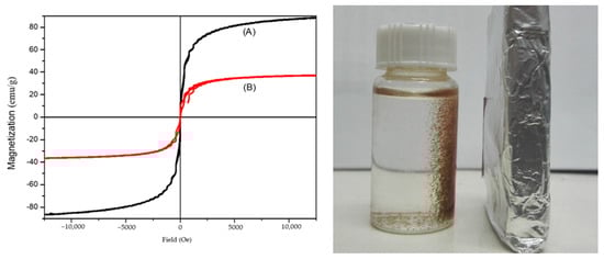 Magnetization curves: (A) Fe3O4 nanoparticles; (B) magnetic hemicellulosic microspheres.