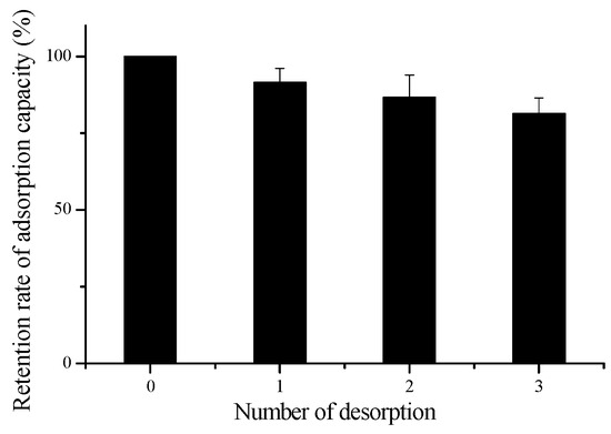 Figure 8 shows the results of the reusability of magnetic hemicellulosic microspheres in adsorbing copper ions. After undergoing three cycles of desorption and adsorption, it is found that the microspheres maintained 81.36% of their adsorption capacity for copper ions, demonstrating its good recycling potential [67], and previous studies using natural polymers-based hydrogels also indicated similar reuse percentages, 80% for lignin-g-PAAc/MMT hydrogel [68], and 85.3% for straw biopolymer-based hydrogel [69]. The magnetic hemicellulosic microspheres discussed in this research represent a novel type of polymer material with outstanding properties.