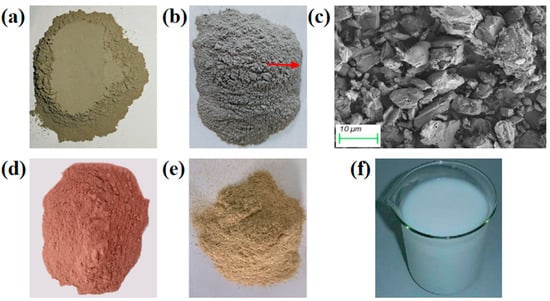 Appearance images of raw materials: (a) OPC; (b) MS; (c) SEM image of MS; (d) soil; (e) straw fiber; (f) acrylate emulsion.