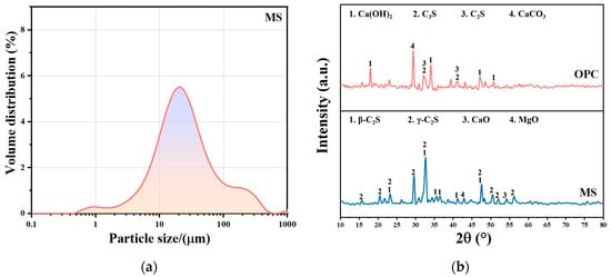 (a) Particle size distribution curve of MS. (b) The phase composition of OPC and MS.