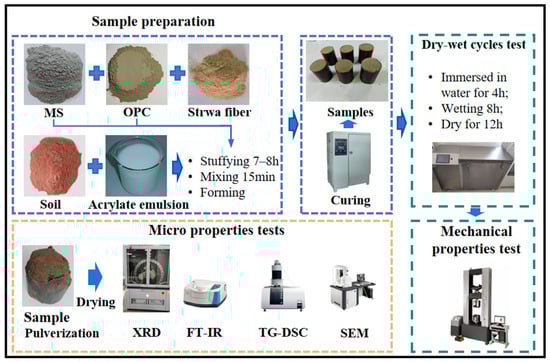 In view of this, the present study investigates the impact of acrylate emulsion on the mechanical properties of straw fiber-reinforced cement–MS-stabilized soil (AE-C-M) through unconfined compressive strength testing. The characteristics of strength loss of the specimen were analyzed through the dry–wet cycles test to explore the quality of its water stability. Additionally, the interaction mechanisms and stabilization principles between acrylate molecular chains and fibers or clay particles are analyzed using XRD, FT-IR, TG-DSC, and SEM techniques. By investigating the synergistic mechanisms among C-S-H gel cementation hardening, the reinforcement treatment with straw fibers, and the polar interactions between AE curing agents and soil particles, the advancement of acrylate-incorporated straw fiber-reinforced cement–MS-stabilized soil in large-scale road engineering applications can be facilitated.