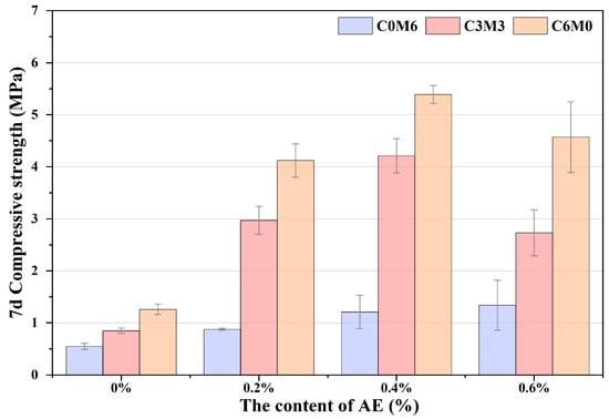 The results of the unconfined compressive strength tests for the AE-C-M stabilized soil after 7 days are illustrated in Figure 4. A notable trend is observed wherein the compressive strength of the specimens initially increases significantly with the rising dosage of AE, followed by a slight decrease. This significant increase in strength can be attributed to the binding and curing effect of calcium silicate hydrate (C-S-H) gel, the strengthening effect of straw fiber, in addition to the film forming effect of acrylate emulsion, which generates a continuous and uniform film on the surface of soil particles. These polymer films have good bonding properties and form strong chemical and physical bonds between soil particles, enhancing the overall strength and stability of the soil. The impact of AE on the strength enhancement of the soil matrix is particularly striking, with the maximum compressive strength of the AE4-C6M0 specimen reaching 5.39 MPa, which represents an increase of over three times compared to the AE0-C6M0 group. This level of strength is wholly sufficient to meet the requirements for heavy traffic loads in high-speed or first-class road base applications. It is noteworthy that when the dosage of AE reaches 0.6‰, the 7-day compressive strength of the specimens decreases to 4.57 MPa. This phenomenon may be associated with the ionization of carboxyl groups within the AE, resulting in electrostatic repulsion of OH− ions around the soil particles, complicating the formation and expansion of the gel membrane necessary for strength development [,]. This also indicates that the hydration reaction in soil matrix leads to the high content of OH−, which is unfavorable to the dispersion of AE components and thus inhibits the film forming effect []. Importantly, the substitution of 50% of the cement with MS did not lead to a significant reduction in strength. In fact, the strength of the AE4-C3M3 composition even exceeded that of the AE2-C6M6 composition, reaching 4.21 MPa, thus satisfying the demands for heavy traffic loads in the construction of highways and arterial roads. The selection of the C3M3 group under the condition of 0.4‰ AE not only meets the strength requirements but also promotes the resource reutilization of metallurgical waste, providing a feasible implementation strategy for future solid waste road engineering applications.