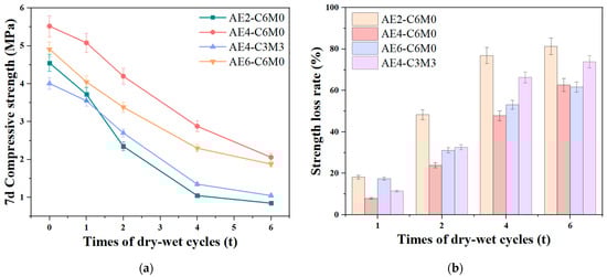 (a) Effect of dry–wet cycles on the 7d compressive strength of AE-C-M. (b) Strength loss rate of AE-C-M under dry–wet cycles.