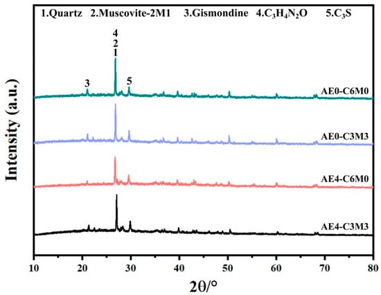 The XRD test results for the AE-C-M stabilized soil are presented in Figure 6. Several significant phase compositions are discerned within the XRD spectrum, including quartz, muscovite-2M1, gismondine, and the C3H4N2O component. Notably, the crystallinity of the C-(A)-S-H gel phase is relatively low, which precludes the manifestation of diffraction peaks within the spectrum. Among the observed diffraction peaks, the one at 2θ = 21.03° corresponds to gismondine, an aluminosilicate mineral that provides the necessary aluminum groups for the transformation of C-S-H gel phase into a high-strength C-(A)-S-H gel, representing a vital constituent of clay minerals []. The diffraction peak located at 2θ = 26.83° corresponds to characteristic peaks of quartz and muscovite-2M1. Silicon exists in the stabilized soil in the form of quartz, while muscovite-2M1 demonstrates considerable diffraction intensity as a component within the soil matrix []. The diffraction peak at 2θ = 29.65° corresponds to C3S, which is a principal mineral component of cement and undergoes hydration reactions to generate C-S-H gel with binding and hardening capabilities []. Furthermore, it can be observed that the incorporation of AE has a minimal impact on the diffraction peak intensity of the products within the system, likely attributable to the low purity and content of the products. Importantly, the diffraction peak for C3H4N2O appears exclusively in the samples containing AE []. This phenomenon may be attributed to the reaction between the carboxyl groups in the acrylic molecular chains and the amino groups present in the soil, which relates to the film-forming and curing actions of acrylic acid within the soil matrix.