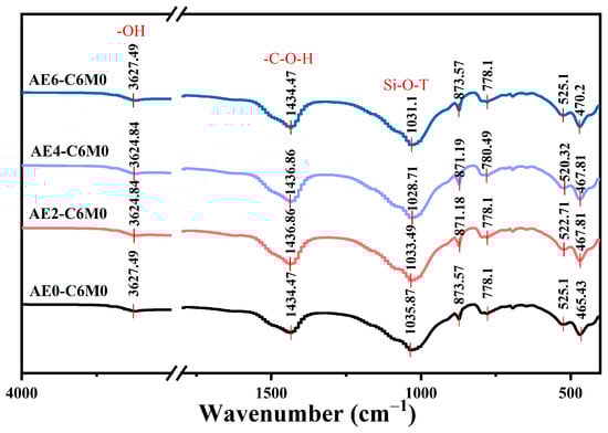 It is also noteworthy that the substantial weight loss observed between 300 °C and 700 °C may be attributed to the thermal decomposition of silicate and aluminate phases within the soil particles of AE-C-M. The integration results of the endothermic peak areas from the DSC curves indicate that AE0-C6M0 exhibits the highest endothermic peak intensity (Area = −117.80 J/g), while AE4-C0M6 demonstrates a substantially lower trend (Area = −83.07 J/g). This phenomenon can be attributed to the lower reactivity of the MS in the system compared to that of cement, resulting in a reduced quantity of C-S-H gel generated during the hydration process, which consequently leads to a lower upper limit of endothermic heat absorption during thermal decomposition []. Importantly, the temperature of the endothermic peaks for the experimental group incorporating 0.4‰ AE is observed to be higher than that of the group without AE incorporation. This indicates that the inclusion of AE enhances the thermal stability of the AE-C-M system. Such a phenomenon is likely related to the film-forming and hardening actions of AE within the system. Consequently, significant reductions in the thermal decomposition rates of AE4-C6M0 and AE4-C0M6 are observed between the temperatures of 30 °C and 221.44 °C. Furthermore, the alkalinity generated within the system during the hydration process of the cementing materials induces changes in both the chemical composition and crystalline structure of the polymers within the soil particles []. The observed decrease in thermal decomposition rates of the experimental groups with increasing AE dosage further suggests the occurrence of interactions and film-forming effects between the acrylic acid and aluminosilicate phases within the soil matrix during the thermal decomposition of acrylic acid, thereby inhibiting the weight loss processes associated with the crystalline water and decomposition of acrylic acid within the structure [].