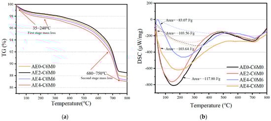 The hydration process of the internal structure of AE-C-M was further analyzed through TG-DSC analysis, as illustrated in Figure 8. It is evident that the thermal decomposition curves of the four sets of AE-C-M samples indicate that the incorporation of AE did not significantly alter the hydration progress of AE-C-M. Within the TG curve, two distinct temperature ranges for thermal decomposition can be observed, corresponding to the two endothermic peaks in the DSC curve.