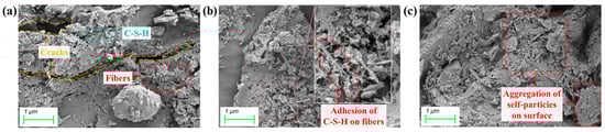 The results of the SEM tests for the AE-C-M stabilized soil are presented in Figure 9. The mechanism underlying the strength enhancement of the AE-C-M stabilized soil is based on the film-forming and solidifying actions of AE on soil particles, as well as the effective adhesion of C-S-H gel to the surface layers of the straw fibers. In Figure 9a, a significant presence of interface cracks and voids can be clearly observed in the structural region of AE0-C6M0, where a considerable number of straw fibers fails to exhibit effective reinforcement. Notably, in the structural region of AE4-C6M0, a marked roughening of certain fiber surface layers is identified, which facilitates the efficient adhesion and bonding of C-S-H gel generated from the hydration of cement and MS to the soil particles []. The roughening of the straw fiber surface layer is likely attributed to the interactions between the carboxyl groups present in the acrylic molecules and the OH− ions produced during the hydration of cement, which may alter the surface characteristics of the fibers, rendering them rougher and irregular []. Such a rough surface can provide a greater number of mechanical interlocking points, thereby allowing for enhanced adhesion of C-S-H gel to the fiber surfaces during the curing process.