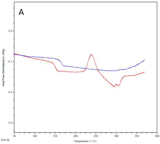 DSC comparison of Arkema 6002 (red) with MCO-derived 60/40 T/I PEKK (blue) for first (A) and second (B) consecutive heating cycles to 350 °C at a rate of 5 °C/min, demonstrating a similarity in glass transitions.