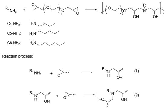 Poly(ethylene glycol) diglycidyl ether (PEGDE; average molecular weight = 500) was purchased from Aladdin (Shanghai, China). The n-pentylamine (C5-NH2, >98%) and n-hexylamine (C6-NH2 > 98%) were purchased from TCI (Tokyo, Japan). The n-butylamine (C4-NH2, >98%) was purchased from Adamas-beta (Shanghai, China). All other chemicals were used without further purification.