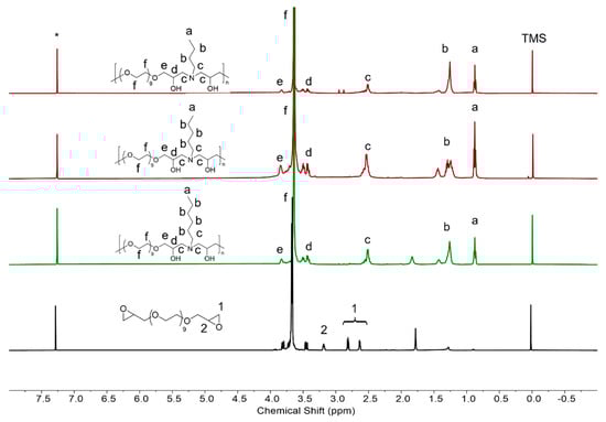 1H NMR spectra of C4PEG, C5PEG, C6PEG, and PEGDE in CDCl3. Chemical shifts are reported as δ values (ppm) relative to internal Me4Si (TMS). Solvent signals are marked with *.
