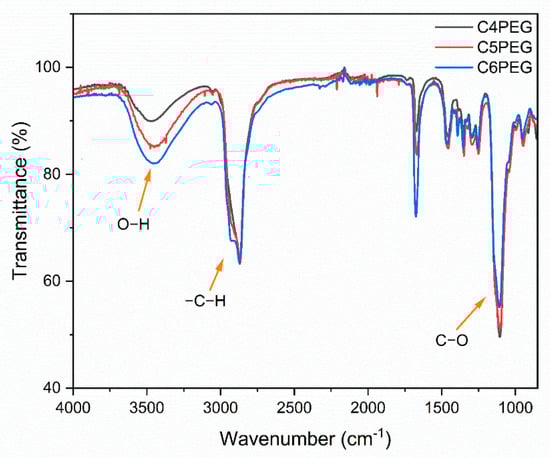 The molecular structures of CPEG were further confirmed via attenuated total reflection Fourier-transform infrared (ATR-FTIR) spectroscopy, as presented in Figure 3. The broad absorption band observed between 3300 and 3600 cm−1 corresponded to hydroxyl (O−H) stretching vibrations, which are indicative of the presence of hydroxy groups in the polymer chains. Additionally, a broad peak located at approximately 2860 cm−1 was associated with the stretching vibration of alkyl (−C−H) bonds, which are typical of the polymer backbone. The intense band appearing at around 1098 cm−1 was attributed to C−O stretching vibrations, confirming the presence of ether groups in the molecular structure. These characteristic peaks suggested the successful synthesis of CPEG variants, with consistent molecular structures across different chain lengths (C4PEG, C5PEG, and C6PEG).