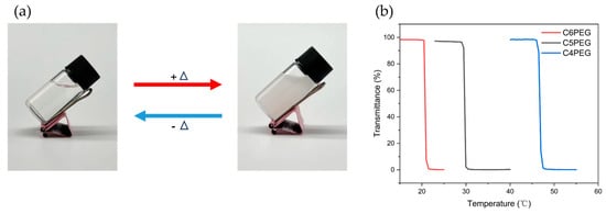 (a) Photographs of an aqueous solution of C5PEG at 20 °C (left) and 50 °C (right). (b) The curves of transmittance versus temperature for C4PEG, C5PEG, and C6PEG in the 5 wt% aqueous solution.