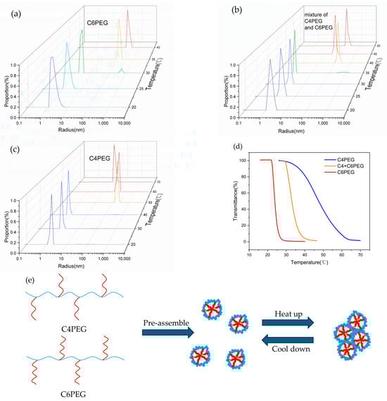 C6PEG and C4PEG were chosen for further study; these had the lowest Tcp and highest Tcp among the CPEGs. The, in general, thermally induced aggregation behaviors of CPEGs are shown in the substantial differences in their Tcps. The thermally induced phase transition was thus studied via dynamic light scattering (DLS), and the aggregate sizes of the CPEG polymers were determined. The results are plotted in Figure 7 from sample C6PEG (a), which comprises a mixture of C4PEG and C6PEG (b), and C4PEG (c) with a diluted concentration (0.5 wt%). Lower concentrations were chosen to minimize multiple light scattering effects, ensuring that size measurements were more accurate []. As the temperature increased, the size of the copolymer particles increased from approximately 2 nm to above 200 nm, indicating a characteristic thermoresponsive aggregation behavior.