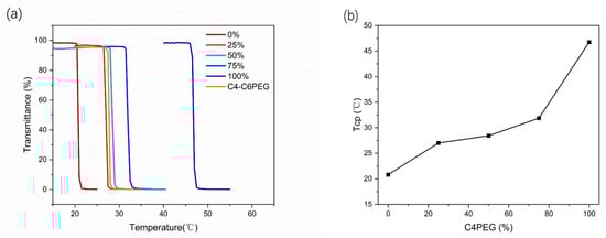 (a) Effects of different mixing ratios in C6PEG and C4PEG mixtures (copolymer concentration 2.5 wt%) on the change in cloud points; the proportion of C4PEG is shown in the figure. Comparison of the cloud points of C4PEG and C6PEG copolymers and the C4PEG and C6PEG mixture. (b) Tcp-dependence of the C4PEG and C6PEG mixture on the content of C4PEG.