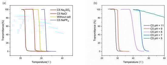 With the exception of the changing proportions of the CPEG mixture, salt addition and pH regulation are common methods for changing phase-transition temperatures []. Given its moderate Tcp, C5PEG was selected as a model system to assess Tcp variations in response to different salts and pH. Previous studies have shown that salt can significantly influence the phase-transition behavior of thermoresponsive polymers, an effect often described via the Hofmeister (HS) series. While cations generally exert a minor influence on Tcp, according to the HS series, anions play a primary role. Therefore, sodium was used as the fixed cation, and anion types were varied among different salts. The effects of NaCl, Na2SO4, and NaPF6 on the thermally induced phase transition of C5PEG were investigated by adding these salts (50 mmol·L−1) to 2.5 wt% C5PEG solutions. The observed Tcp variations largely aligned with the HS series. For example, the addition of “salt-out” anions, such as Cl− and SO42−, lowered Tcp from 29.1 °C to 26.7 °C and 22.2 °C, respectively. In contrast, the “salt-in” anion PF6− increased Tcp from 29.1 °C to 32.1 °C. Anions with lower lyotropic numbers tend to dehydrate the polymer chains by displacing water molecules, thus strengthening hydrophobic interactions and promoting polymer collapse into particle states. Conversely, anions with higher lyotropic numbers interfere with the structure of bulk water, enhancing polymer hydrophilicity [].