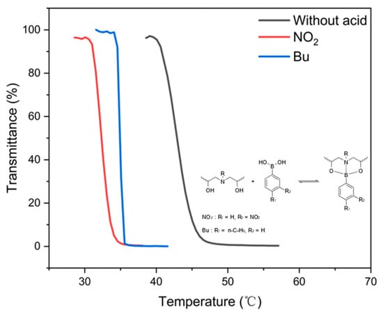 Phenylboronic acid derivatives can react with the diethanolamine (DEA) unit in the main chain of CPEG to form a borate ester and realize boron–nitrogen (B–N) coordination with two five-member rings. This unique coordination enables hydrophobic groups to be anchored to the polymer’s main chain, changing its overall hydrophilicity. Specifically, as shown in Figure 10, the addition of phenylboronic acids with hydrophobic substituents—such as nitro and butyl groups—resulted in notable Tcp reductions, with Tcp values observed at 32.4 °C and 35 °C, respectively. This decrease in Tcp demonstrates that incorporating hydrophobic groups via phenylboronic acid modification effectively enhances polymer hydrophobicity and lowers the transition temperature. These findings indicate that modifying thermoresponsive polymers with different phenylboronic acid derivatives provides a viable strategy for controlling Tcp.