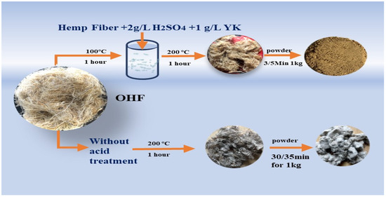 First, a beaker containing 200 mL of boiled deionized water was placed in a 100 °C water bath for insulation. Then, 2 g/L sulfuric acid, 1 g/L YK agent (which aids in the dilution of chemicals into fibers), and 10 g of leftover untreated hemp fiber (cut to 2 mm × 3 mm) were sequentially added to the beaker. The bath ratio was 1:20. After heating the beaker for 1 h, the hemp fiber was washed 7–8 times until the pH value reached 7. Next, a padding machine or hand roller was used to remove excess water. Finally, the hemp fiber was placed in an oven and baked at 200 °C for 1 h. Additionally, powder was prepared for AFM analysis by dissolving the hemp powder using C2H6O at 39.82 g/L with hemp powder at 0.70 g/L for 30 min, Figure 1. The acid modification process is illustrated in Figure 2.