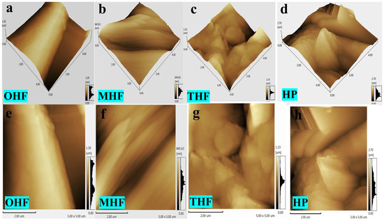 AFM scanning images measuring 5 µm × 5 μm of (a) original hemp fiber (OHF), (b) modified hemp fiber (MHF), (c) high-temperature hemp fiber (THF), and (d) hemp powder (HP). (e) OHF, (f) MHF, (g) THF, (h) HP.