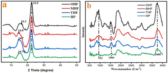 The FTIR spectrum in Figure 5b was normalized for better analysis of the chemical modification of hemp fiber and powder. All four curves presented similar peak positions, indicating that, after acid treatment, temperature changes, and crushing, the characteristic group changes occurred primarily at 933 cm−1, 1504 cm−1, and 3734 cm−1. The main components of hemp fiber are cellulose and hemicellulose. These components correspond to the C–O, C=O, and hydroxyl groups (-OH), which form strong bonds. During hydrolysis, the β-1,4-glycosidic link is broken, though this has little impact on the strength of the C–O and O–H bonds [9]. Lignin typically exhibits absorption bands associated with C–H stretching and aromatic skeleton vibrations, while hemicellulose shows bands linked to the stretching of acetyl groups or other functional groups along their C–O bonds. At approximately 1645 cm−1, pectin exhibits noticeable antisymmetric stretching vibration of the carboxylate group. High-crystalline cellulose is not easily hydrolyzed, while hemicellulose has a low-energy, random amorphous structure [46]. MHF and THF show slight changes in their curves. OHF indicates that the chemical composition and temperature of the hemp fiber changed after modification. The reaction is the hydrolysis of cellulose in hemp fiber, breaking the glycosidic bonds between glucose units and producing nanocellulose, a nanomaterial with improved properties [35]. Sulfuric acid cleaves the amorphous portions of cellulose fibers during this process, producing nanocellulose with a crystalline structure. The intensity of the peaks is significantly reduced after modification.