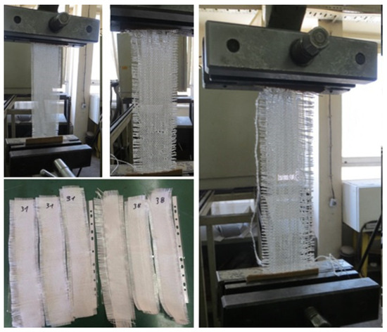 The structural characteristics of woven fabrics have a significant influence on the appearance, durability, and behavior of woven fabrics in different applications. They are mostly determined by the type of yarn, as well as by the process parameters of the weaving machine. The key structural characteristics of woven fabrics are the type of weave structure, yarn type and count, yarn density, fabric weight and thickness, etc. [34,36]. Electron microphotographs of the structure of the used E-glass woven fabrics were obtained using a binocular microscope ZOOM 645 and a scanning electron microscope type VEGA3 LMU from the Tescan company, Brno–Kohoutovice, Czech Republic. These photos were taken to observe the differences in the weave structure of the applied woven fabrics, that is, the way of interweaving the weft and warp yarns. Additionally, tensile strength and elongation at break in the longitudinal and transverse directions were determined according to the ASTM D 5035 standard [42]. A Schenck Universal Tensile Strength Testing Machine was used for this test. The tensile strength of woven fabrics made of the most important mechanical properties makes them superior for many industrial applications compared to knitted and nonwoven textile materials. For this purpose, from all three types of woven fabrics, three samples (strips) with dimensions of 200 × 48 mm were cut in the weft and warp directions. The samples were fixed in the test machine with the help of 60 mm wide clamps (Figure 1).