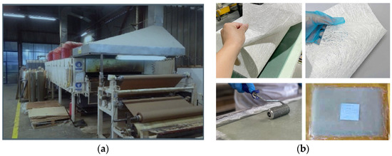 From all woven fabrics, prepregs with suitable characteristics were produced in the laboratories of the company Laminati Kom D.O.O. Prilep, R. North Macedonia by using the impregnation machine (Figure 2a). Nonwoven textile structures were hand-impregnated into prepregs (Figure 2b), and the UD glass prepreg was the commercial product SIGRAPREG® from SGL company, Wiesbaden, Germany. Making a good prepreg requires precise control and a good understanding of the resin flow and how it behaves under the influence of the heat or pressure being added in the cured state [24]. The basic characteristics for all produced prepregs are summarized in Table 3, and in the same table, the characteristics of the commercial UD prepreg are presented.
