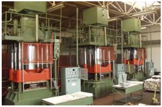 From all five different prepregs, laminate panels (composite plates) were produced by using compression molding technology. The samples were produced in the laboratories at the company Laminati Kom d.o.o. in Prilep. Laminate panels with dimensions of 250 mm × 200 mm were produced by stacking 10 prepreg layers from all five different types, wrapped with fireproof paper, and carefully placed in the open mold press machines (Figure 3). The laminates were performed with a specific pressure (from the machine) of 14 kg/cm2 (30 bar) for all five samples. However, the compression temperature for the samples from the produced prepregs (I, II, III, and IV) was 80 °C for a curing of 1 h and 110 °C for a post-curing of 1 h. To produce laminate samples from the commercial UD prepreg, the compression temperature was 90 °C for a curing of 1 h and 120 °C for a post-curing of 1 h, based on the recommendation from its manufacturer (Table 4). After the press cycle, the composite plates were left to stand for a few hours to allow the resin mixture to fully combine and dry out, ensuring complete curing. Then, from all five specimens (composite plates), the test specimens were cut in the MD and CD directions according to the testing standard for mechanical characterization.