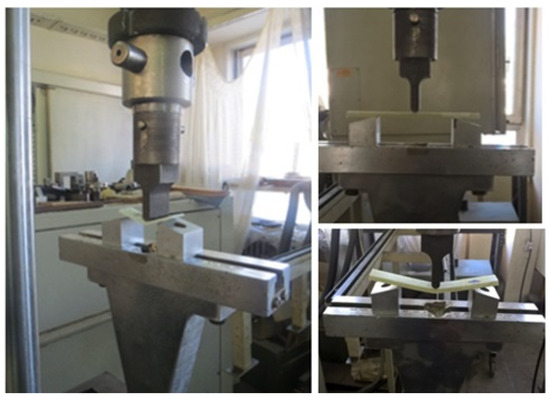 The flexural properties of cut composite samples from the manufacture plates (L-I, L-II, L-III, L-IV, and L-V) were determined with the help of the three-point bending test in accordance with the procedure described in the standard EN ISO 14125 [47]. For that purpose, the computer-controlled universal testing machine (UTM) Hydraulic press, SCHENCK-Hidrauls PSB with a maximal load of 250 kN, constant crosshead speed of 5 mm/min, and span-to-depth ratio of 16:1 was used. The standard dimensions of the tested samples according to EN ISO 14125 are i.e., (15 × 60 × sample thickness) mm. The rectangular samples were cut in two orientations, the machine direction (MD) and the cross direction (CD), and were tested under the same conditions to ensure reproducibility. The dimensions (length, width, and thickness) of each specimen were measured with the help of a micrometer instrument. The flexural strength of the prepared composite specimens was evaluated using a Universal Testing Machine (UTM), which is illustrated in Figure 4. Load and displacement were recorded by an automatic data acquisition system for each sample. A minimum of five reproducible tests were performed for each sample at room temperature.