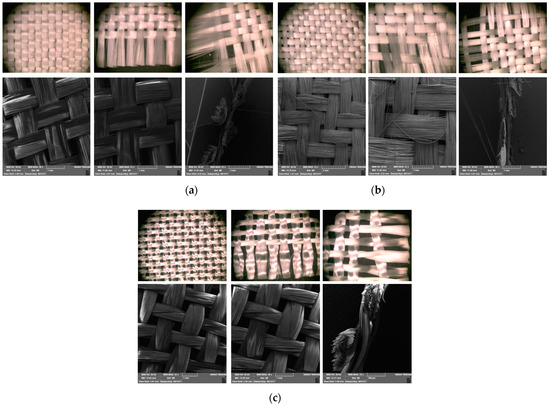 The electron micrographs presented in Figure 6 for test Samples I, II, and III at different magnifications reveal distinct differences in the interweaving of warp and weft yarns in the woven glass fabrics. In the first and second analyzed samples, two diverse types of weaves (plain and twill 2/2 Z) are represented, which belong to the group of basic types of interlacing, while in the third sample, we find the basket 2/2 weave structure (interlacing derived from plain weave).