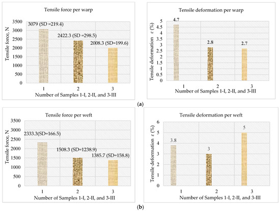 Figure 7 presents the obtained values for tensile strength (N) and tensile deformation (%) of the analyzed woven fabrics, determined according to the ASTM D 5035 standard [42]. The results are the mean values of three measurements of the tensile strength in the warp (longitudinal) direction and the weft (transverse) direction.