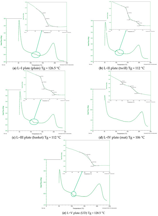 In order to conclude that the degree of polymerization of the epoxy resin system was complete in all the samples, a DSC analysis of all composite plates was performed. A sample in a powder form was taken from each plate, and DSC analyses were performed on the DSC Q2000 (Mettler-Toledo TA Instruments, New Castle, DE, USA) with a rate of 40 K/min, in accordance with the procedure described in the standard ISO 11357-1 [48]. For transitions such as the glass transition, DSC enables the measurement of temperatures and heat flows associated with thermal transitions in a material.