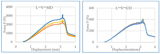 Force and displacement graphs for L−V MD and L−V CD test samples with three replications presented with different colors of the curves