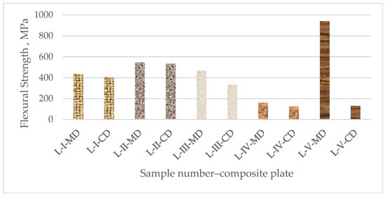 The composite samples reinforced with unidirectional prepregs (L-V) have the highest resistance to bending forces in the longitudinal direction (MD) and the lowest in the transversal direction (CD), according to a comparative analysis of the results obtained for the flexural properties of all sample composite plates. Namely, the test samples L-V-MD have about ten times higher flexural strength than the same sample tested in the transversal direction (L-V-CD). Because of the UD structure, the mechanical characteristics of these samples are unbalanced between the fiber direction and the transverse direction. The UD prepreg has advantages because of its non-weaving process, and for their application into composites, there is a possibility of utilizing the high load-bearing capacity of the fibers when they are loaded in their direction.