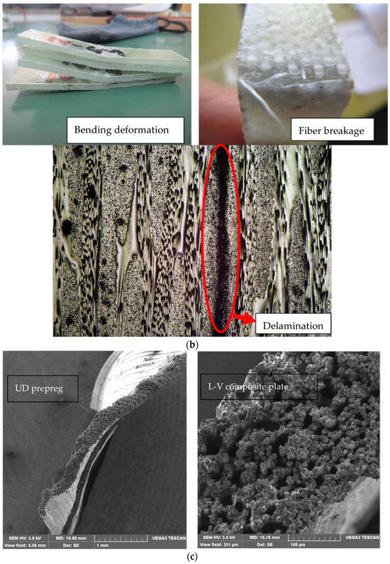 Optical and scanning electron images of prepregs and composite plates. (a) SEM image of glass woven prepregs: good fiber–matrix interface in the prepreg (in the impregnation process). (b) Illustrations of the deformation and fiber breakage after the breakage test of Sample L-I-MD and an optical microscope image. (c) SEM image of the glass UD prepreg (left) and SEM image of a cross-section of the broken L-V composite plate (right) after testing.