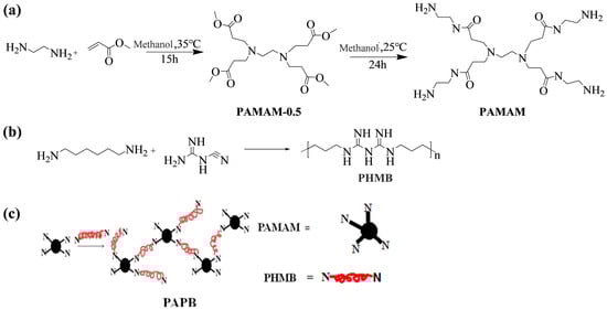 Synthesis equation of polyhexamethylene biguanide salt PAPB with four-arm branched nucleus. (a) Synthesis equation of PAMAM; (b) Synthesis equation of PHMB; (c) Synthesis equation of PAMAM.