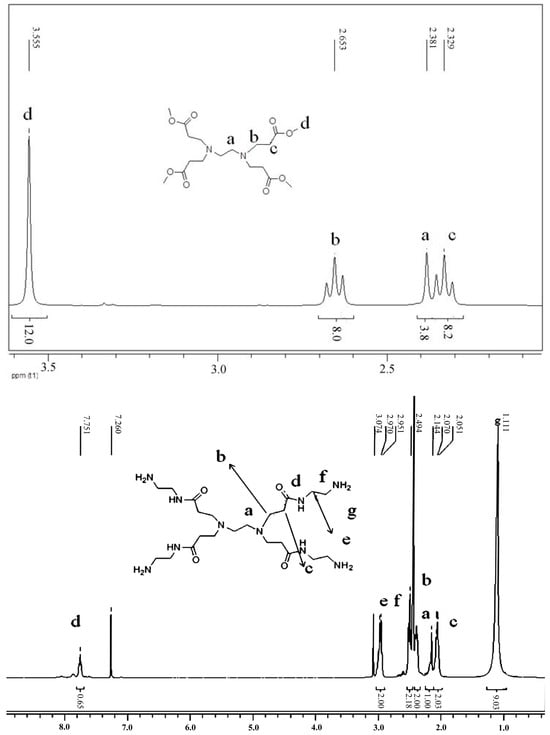 Synthesis of PAMAM-0.5: The synthesis process is as shown in Figure 1a. In a round-bottom flask (250 mL), a solution of methanol (70 mL) and excess methyl acrylate (272 mmol) was mixed uniformly. The temperature of the system was reduced to about 5 °C, while the round-bottom flask was placed in an ice bath. Then, 30 mL of methanol solution containing 27.2 mmol of ethylenediamine was added slowly under a nitrogen atmosphere within 1 h. The reaction system was placed in an ice water bath for 30 min and then placed in a water bath at 35 °C for 15 h. The completion of the reaction was monitored by thin-layer chromatography (TLC). All the methanol and methyl acrylate were removed by vacuum distillation. PAMAM-0.5 was obtained with a yield of 98.5% (6.06 g). 1H NMR (300 MHz, CDCl3, ppm): δ 2.33 (t, J = 7.2, 8H), 2.38 (s, 4H), 2.65 (t, J = 7.2, 8H), 3.56 (s, 6H). IR (cm−1): 2952, 2828, 1738, 1437, 1329, 1198, 1174.