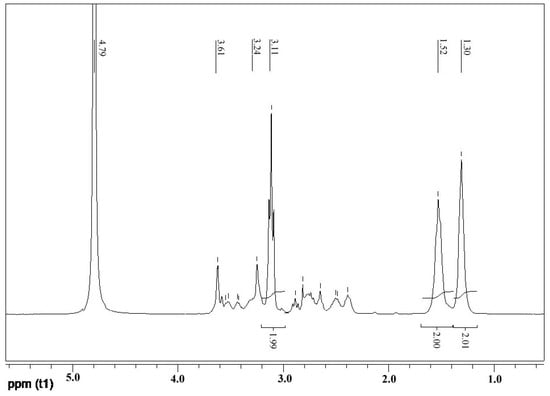 A2 (PHMB) and B4 (PAMAM) monomers were used to synthesize the hyperbranched polymer PAPB by melt polymerization, and the structure of the final product was determined by FT-IR and NMR. Figure 3 shows the 1H-NMR spectra (D2O) of PAPB1. Because of the use of deuterated water as a nuclear magnetic solvent, the active hydrogen on the amino and imino groups in the PAPB1 molecule is rapidly exchanged with the deuterated reagent, and their peaks disappear. It can be seen from the figure that δ = 1.30, δ = 1.52, and δ = 3.11 were the three kinds of hydrogen of hexamethylenediamine of PAPB1, and the integral ratio of hydrogen was 1:1:1. When PHMB reacted with PAMAM, some of the amine groups were replaced by biguanides, and that was why the ethyl hydrogen connected to it shifted to the lower field (δ = 3.61, δ = 3.53). The peak positions of the rest of the proton hydrogen were consistent with PAMAM.