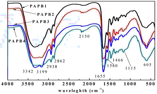 The FT-IR spectrum of the PAPB is shown in Figure 4. The 3342 cm−1 and 3199 cm−1 peaks were assigned to the stretching vibration of -NH2. The asymmetric stretching vibration (νas) and symmetric stretching vibration (νs) of -CH2- were observed at 2938 cm−1 and 2866 cm−1, respectively. The characteristic bands of amide bonds (νC=O) and (δNH and νCN) were noticed at 1655 cm−1 and 1560 cm−1, respectively. The bending vibration (δas) of -CH2- was observed at 1466 cm−1. The 1188 cm−1 and 1115 cm−1 peaks were assigned to the stretching vibration (νCN) of primary and tertiary amines, respectively. It was shown that the PAPB1 contained characteristic groups such as -NH2, -CH2-, -CONH-, and C = N, which were consistent with the characteristics of the theoretical structure.