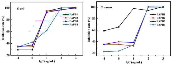 Inhibition rate of PAPB with various concentrations against E. coli and S. aureus.