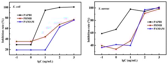 In order to quantify this chemical binding synergy, the inhibition rates of PHMB, PAMAM, and PAPB against E. coli and S. aureus were determined by turbidimetry. Figure 7 shows the experimental results of the inhibition rate.