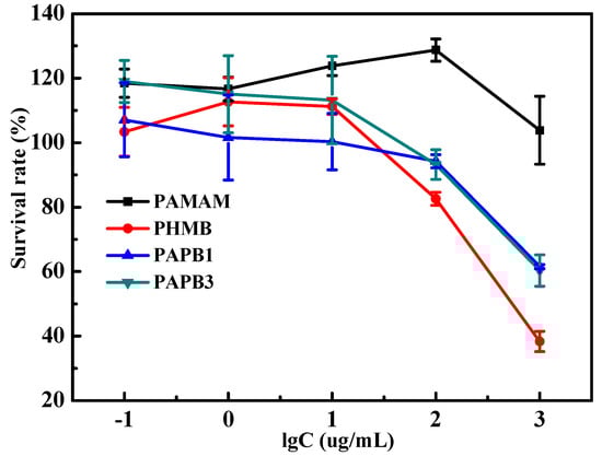 Figure 9 shows the toxicity of PAMAM, PHMB, and PAPB on a 3T3 cell, which is expressed by the survival rate of the 3T3 cell. It can be seen from the figure that the cell survival rates were dependent on the concentration of antibacterial agent. With the change in the concentration, all the cell survival rates showed a certain change. When the concentration of the antibacterial agent was below 100 micrograms per liter, the survival rate of 3T3 cells often exceeded 100%. This could be due to experimental errors, or it could indicate that PAMAM has a certain proliferative effect on 3T3 cells. Either way, it suggests that PAMAM exhibits good biocompatibility at low concentrations. With the increase in the concentration, the cell survival rate decreased slightly. And when the concentration of the antibacterial agent exceeded 100 μg·L−1, the survival rate of 3T3 cell varied greatly. The survival rate of PAMAM-treated 3T3 cells was still greater than 100%, which proved that PAMAM is indeed a class of compounds with biocompatible and low-toxicity properties [11]. The effect of antibacterial agents on the survival rate of 3T3 cells was PAMAM-treated 3T3 cells > that of PAPB1-treated 3T3 cells ≈ that of PAPB3-treated 3T3 cells > that of PHMB-treated 3T3 cells. The survival rate of PHMB-treated 3T3 cells with 1000 μg·L−1 was 38%, while that of PAPB-treated 3T3 cells was 60%, which indicates that the introduction of PAMAM with less biotoxicity into PHMB was beneficial to reduce the molecular toxicity.