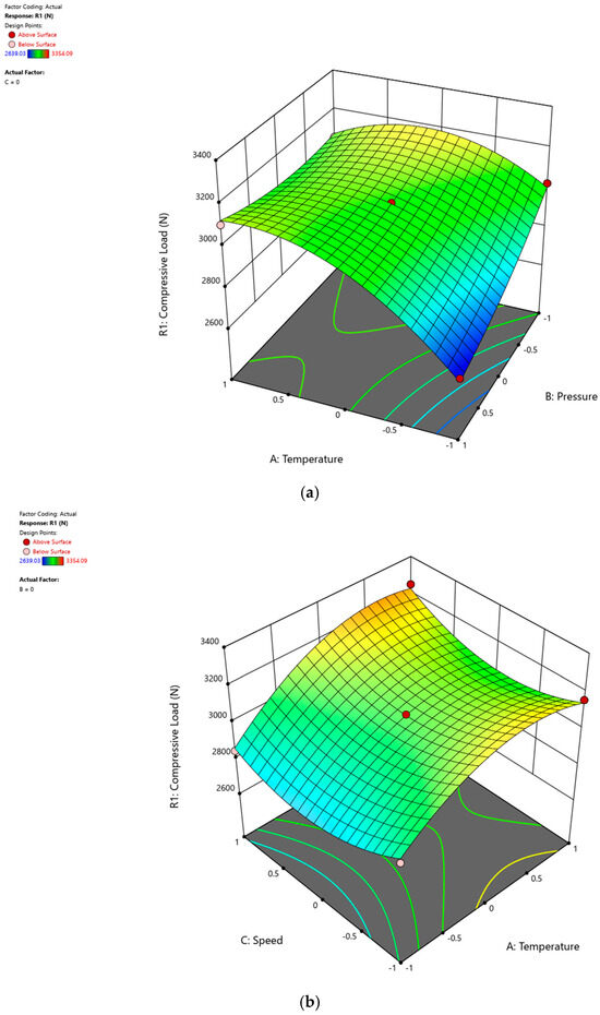 The response surface is a three-dimensional graphical representation of the data that facilitates the interpretation and understanding of the relationships between independent and dependent variables. The effects of process parameters on the compressive load of GF/PPS and GF/PP composites are visually represented through response surface graphs in Figure 9a–c and Figure 10a–c. These graphs were generated based on the model equations (Equations (3) and (4)), clearly illustrating how variations in process parameters influence the compressive load. In each graph, the third parameter is constant at the center point, which corresponds to zero, as indicated in Table 4 and Table 5. Keeping one parameter constant enables a more focused analysis of the interactions between the other two parameters and their influence on the response. The central value, representing the midpoint of the experimental range, serves as a balanced reference point, ensuring consistent comparisons across parameter combinations. This systematic approach, combined with the mathematical model equations, comprehensively accounts for the effects of all three parameters, providing detailed insights into their individual and combined impacts on the system response.