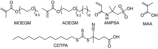 Alkoxy (C12-C14) oligo(ethylene glycol) methacrylate (AOEGM) and oligo(ethylene glycol) methyl ether methacrylate (MOEGM, Mn = 500) from Sigma-Aldrich (Moscow, Russia) (Figure 1) were used as base macromonomers, which were purified of inhibitors by passing them through a column filled with basic alumina. AOEGM was synthesized by the esterification of methacrylic acid with alkoxy oligo(ethylene glycol) containing a C12-C14 alkyl fragment (Zavod sintanolov LLC, Dzerzhinsk, Russia) in the presence of p-toluene sulfonic acid (JSC Khimreaktiv, Nizhny Novgorod, Russia) as a catalyst. As acidic comonomers, 2-Acrylamido-2-methylpropanesulfonic acid, AMPSA, without additional purification from Sigma-Aldrich (Moscow, Russia) and methacrylic acid (JSC Khimreaktiv, Nizhny Novgorod, Russia) purified by distillation were used. The RAFT agent (4-cyano-4-[(dodecylsulfanylthiocarbonyl)sulfanyl]pentanoic acid), CDTPA, was synthesized according to the procedure described in the work [49]. Other reagents, namely, acetonitrile (for spectroscopy, ≥99.5%), tetrahydrofuran (ACS reagent, ≥99.5%), and dimethyl sulfoxide (ACS reagent, ≥99.5%) from Aldrich (Moscow, Russia) were used as received.