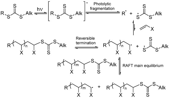 In the case of the PI-RAFT process, polymerization is initiated by homolytic cleavage of the C-S bond, resulting in the elimination of the leaving group. Either π-π* or n-π* transitions are responsible for driving this process. The band associated with photo-excitation through the n-π* transition is weaker, but produces less side reactions of CTA degradation. The required wavelength varies depending on the CTA type, falling within the visible region for trithiocarbonates and dithiobenzoates [53].