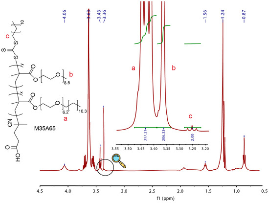 The NMR spectrum of the copolymer. The enlarged region contains signals of the terminal methyl group of MOEGM, the methylene group of the alkyl moiety of AOEGM, and the methylene group of the RAFT agent to establish the molecular weight.
