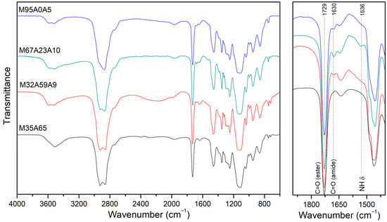 Incorporation of the AMPSA comonomer is confirmed by infrared (IR) spectroscopy data, as shown in Figure 4. The IR spectrum of the molecular brushes containing AMPSA shows characteristic bands assigned to the carbonyl group stretching vibration (C=O, 1729 cm−1), ether bond asymmetric stretching vibration (C-O-C, 1115 cm−1), and bands of methylene (-CH2) and methyl (-CH3) groups at 2861 cm−1 and 2925 cm−1, respectively. The broad band at 3300–3700 cm−1 is attributed to OH vibrations in hydrogen-bonded water. The absorption bands at 1678 and 1536 are attributed to C=O (amide) stretching and NH bending vibrations, respectively. It should be noted the significantly lower activity of acrylamides in copolymerization with methacrylates; a similar situation is typical of acrylamido–sulfonic acids, including AMPSA. The amide carbonyl peaks indicate very low AMPSA content in the copolymers.