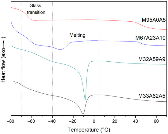 The copolymers exhibited two distinct types of transition in the DSC thermograms, namely, glass transition and melting. The first transition is due to MOEGMA units and the second is due to the melting of alkyl fragments of AOEGMA. Table 2 presents the numerical values of Tg and Tm. The glass transition becomes more pronounced in samples with a higher content of MOEGM, M67A23A10, and M95A0A5, whereas the transition is hardly noticeable in samples of about 33% content. The glass transition temperature varied, ranging from −48 to −64 °C, depending on the copolymer composition. The melting point (Tm) of AOEGMA was observed to broaden in all the copolymers as a consequence of the presence of OEG moieties, which are inherently poorly crystallizable (Figure 5).