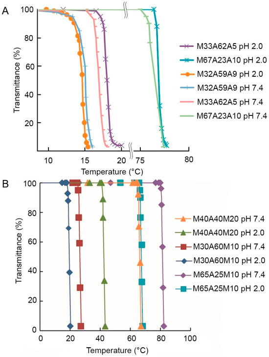 A completely different picture is observed in copolymers containing weak electrolyte MA units; in these cases, the shift in phase transition temperature when changing from pH 2 to 7 can reach 24 °C (as in sample M40A40M20, which contained the maximum percentage of MA units and had an equimolar ratio of base comonomers). Sample M40A40M20 showed a prolonged transition at pH = 9.18 within a 40–90 °C range, with transmittance at the last point of slightly less than 60%.